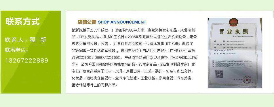 深圳市振新泡棉科技有限公司于2003年成立,廠房面積7800平方米。主營(yíng)海棉發(fā)泡制品、PU發(fā)泡制品、EVA發(fā)泡制品、海棉加工機(jī)器。2006年引進(jìn)國(guó)外先進(jìn)的生產(chǎn)機(jī)械設(shè)備,配備現(xiàn)代化精密儀器、儀表 , 并自行開(kāi)發(fā)多款新一代海棉異型加工機(jī)器,改良了QLY-06型一次性話筒套機(jī)器 , 現(xiàn)擁有多條半自動(dòng)化生產(chǎn)線。 我們擁有一批經(jīng)驗(yàn)豐富的工程技術(shù)人員和高級(jí)管理人員,在同行業(yè)中率先通過(guò)ISO9001:2008及ISO14001:產(chǎn)品原料均采用新型環(huán)保料,符合多國(guó)出口標(biāo)準(zhǔn)。 公司系國(guó)內(nèi)知名特殊海棉發(fā)泡制品、PU發(fā)泡制品、EVA發(fā)泡制品生產(chǎn)廠家,專業(yè)研發(fā)生產(chǎn)適用于電子、玩具、家居日用、工藝、裝飾、包裝、辦公文體、化妝品、運(yùn)動(dòng)類保健器材、空氣凈化過(guò)濾、工業(yè)機(jī)械、家用電器、汽車美容、醫(yī)療保健等行業(yè)的海棉產(chǎn)品。 產(chǎn)品的類型如:高密度聚酯海棉、普通海棉、異型定型海棉、防火/阻燃海棉、高回彈/慢回彈海棉、過(guò)濾網(wǎng)狀海棉、EVA玩具禮品、PU發(fā)泡定型玩具禮品等等。產(chǎn)品名稱如:耳機(jī)/話筒KTV海棉套、海棉圓球、洗刷海棉、吸水海棉、木漿海棉、化妝海棉、相機(jī)海棉、墨盒海棉、壓縮海棉、橡膠海棉、粗細(xì)孔過(guò)濾海棉、波峰隔音海棉、醫(yī)用海棉、海棉枕頭、包裝防震海棉、1mm厚海棉、電子/醫(yī)用海棉棉簽、EVA球、EVA智力拼圖、EVA鑰匙扣、PU座墊、PU公仔、PU球類等等。 我們還獲得多家國(guó)際知名廠商的授權(quán)資格,代理多品種家庭用品。 產(chǎn)品多年來(lái)一直銷往全球,深受廣大用戶和客商的青睞。